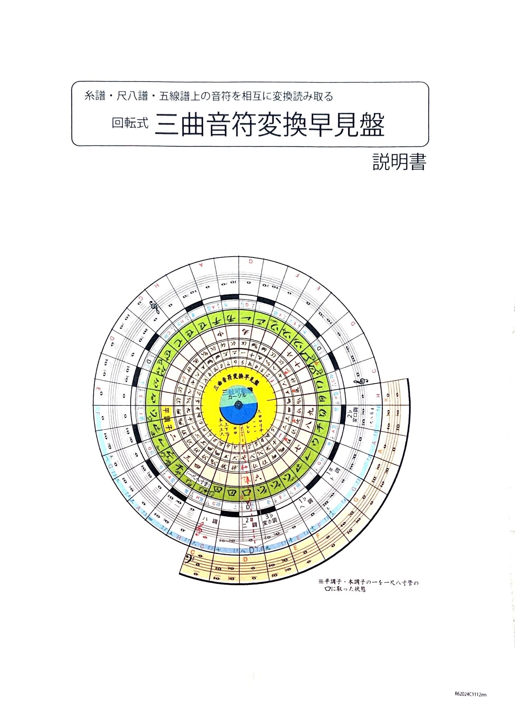 回転式三曲音符変換早見盤は、日本の伝統音楽で用いられる音階を西洋音階に相互変換することができます。現代曲を箏譜や尺八譜に手直しする際にもお使いいただけます。
